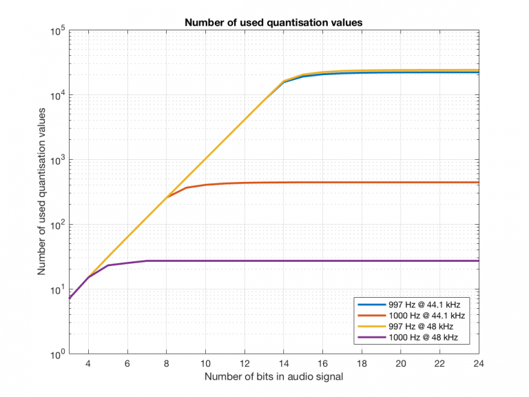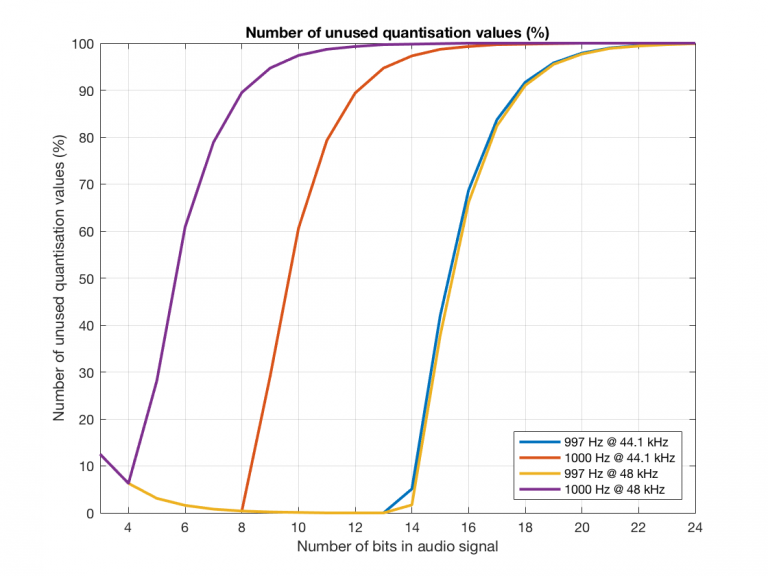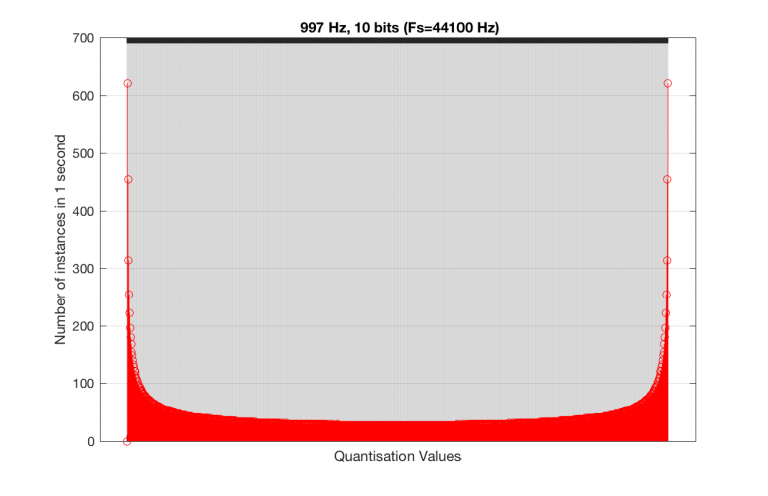 So, as you can see there, in a 16-bit system, even if you use a 997 Hz tone, about 70% of the total possible quantisation values are used.