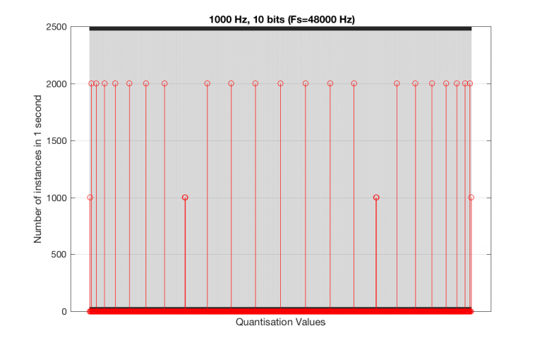 This is because, at some time, we start repeating the cycle. If the sampling rate divided by the signal frequency is an integer value (like a 1 kHz tone in a 48 kHz system), then we don’t use any new quantisation values after the first cycle of the tone (or 1 ms, in this case). If the sampling rate divided by the signal frequency is not an integer value (like a 997 Hz tone in a 48 kHz system) then we don’t start repeating ourselves until 1 second has passed.