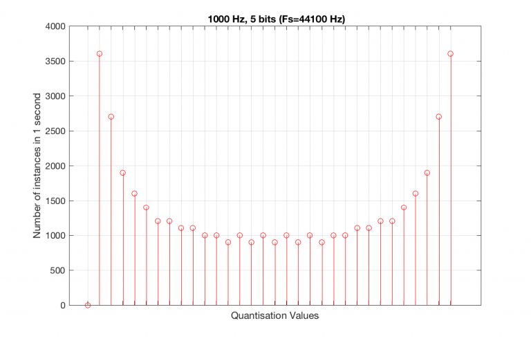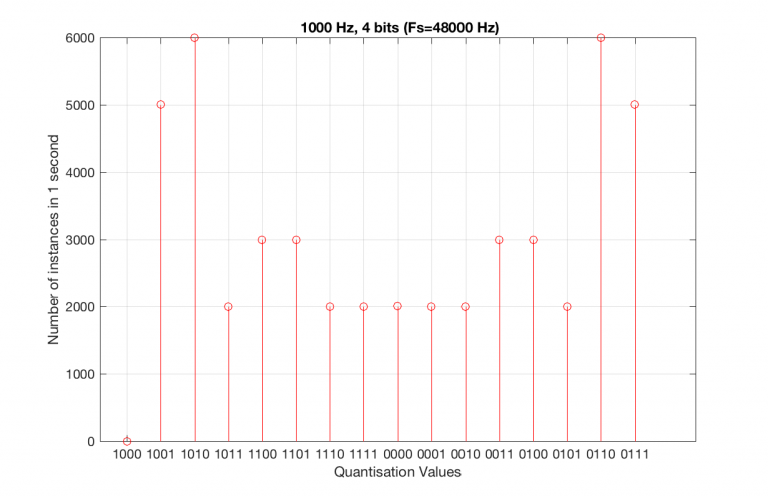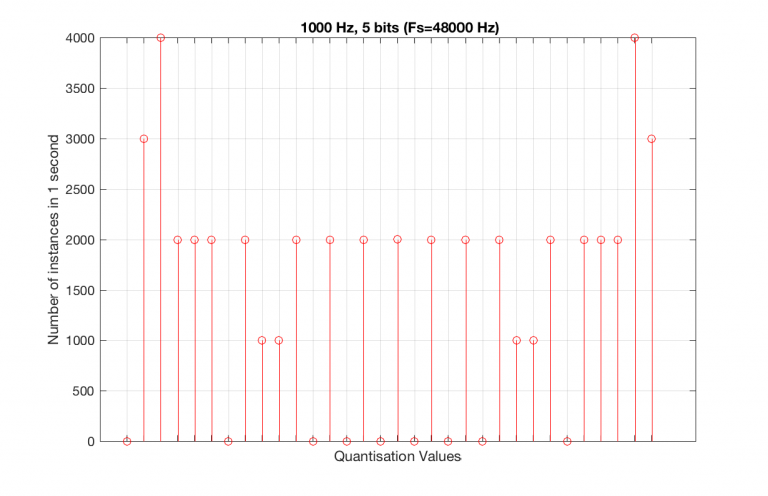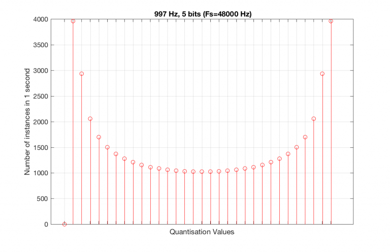 As can be seen in the histograms in Figure 13 and 14, changing the signal to 997 Hz from 1000 Hz results in us using all of the quantisation values in both sampling rates. So, we do a more thorough test, and stand a better chance of not missing anything…