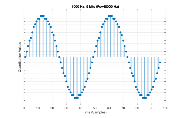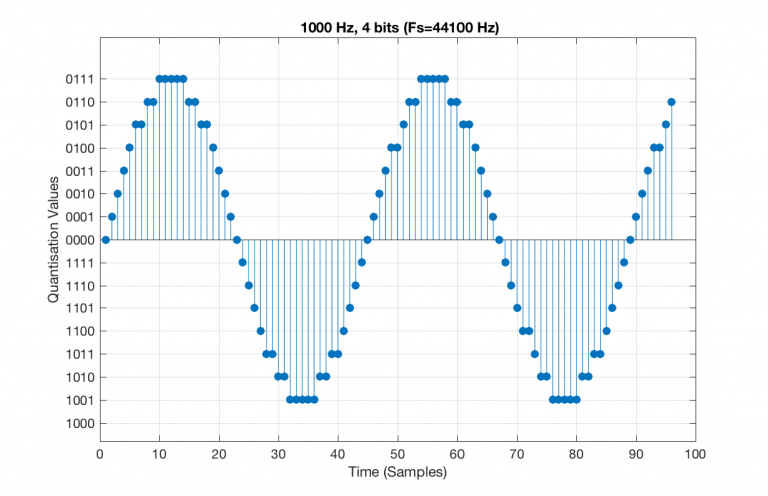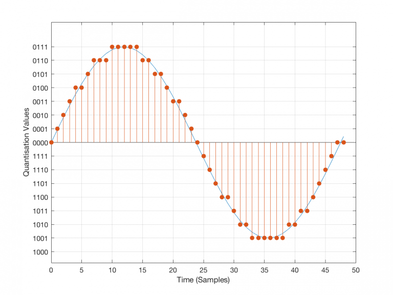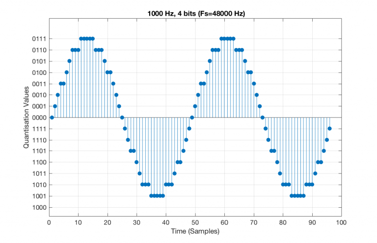 I’ve shown the quantisation values on the left (the Y-axis) as binary values. As you can see there, we have a 4-bit signal which gives us a total of 2^4 = 16 possible quantisation values for storing the signal’s amplitude at each sample.