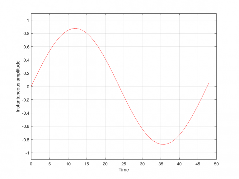 - The second is that the wave is perfectly periodic – meaning that it repeats itself over and over and over… There are two cycles of the waveform shown in the plot, and if you count the dots, you’ll see that the two are identical. This second point is the one that will be important to understand as we go further. The reason this exact repetition happens is because the frequency of the sine tone (1000 Hz) is an integer divisor of the sampling rate (48000 Hz). In other words, 48000 / 1000 = 48 – not a weird number like 48.3.