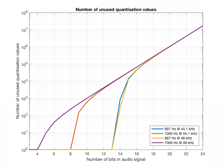 Of course, the signals that I used here were generated digitally, and did not include dither. If I had included proper dithering, then more of the quantisation values would have been used. However, the point of this posting was not to talk about correct ways of creating PCM signals – it was an attempt to explain why we use 997 Hz instead of 1 kHz when we test digital audio systems.