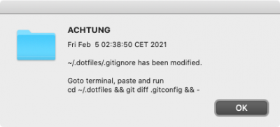 osascript -e 'display alert "ACHTUNG" message "'"$now"'\n\n~/.dotfiles/.gitignore has been modified.\n\nGoto terminal, paste and run\ncd ~/.dotfiles && git diff .gitconfig && -"'